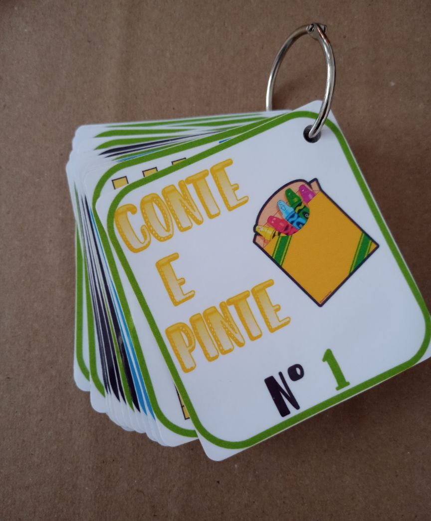 Produto com 47 cartelas, impresso em papel fotográfico e plastificado. O produto enviado é bloco de cartas. O arquivo pdf com a folha será via E-mail. A criança deve contar em cada uma das cartinhas e pintar na folha de acordo com a cor da borda. Ao final formará o desenho do Hulk.